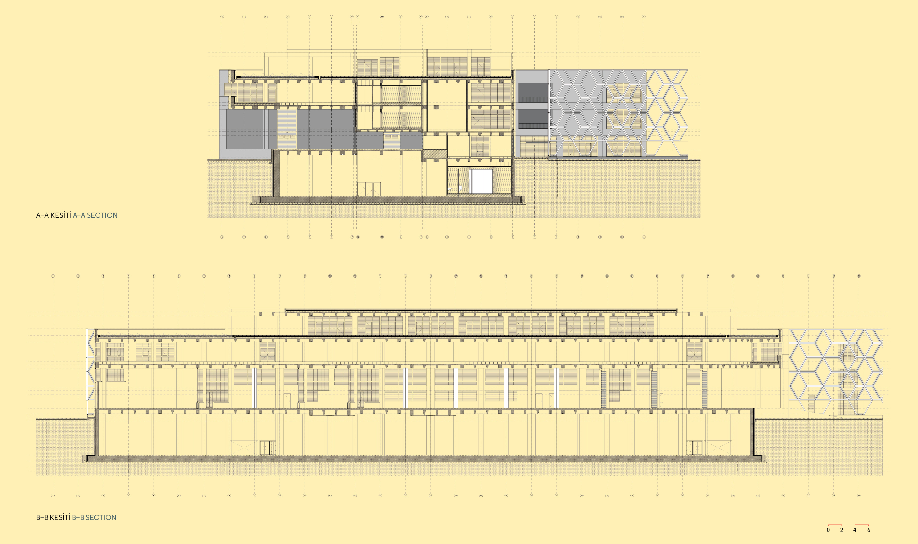 As the İzmir-Muğla motorway does not pass through Ula, the town was relatively better preserved compared to similar other towns. Though somewhat neglected, beautiful examples of local architecture are still in use. Well, the aforementioned road went around Ula instead. The link roads were connected to this main road from both ends of Ula. Visibility by vehicles traveling at a speed of 100 km was the key input for the honey factory to be located on a property within the industrial zone between the two link roads, on the ‘other’ side of the road vis-à-vis Ula. We thus centered our ideas on a building of symbolic character providing both visibility and expressing the corporate identity of the factory. Instead of conventional doors and windows, we enveloped the building in a powerful shell recalling a honeycomb. The space between the building and its shell also creates shaded seating areas, an effect we desire, and also provides overall shade for the entire building.